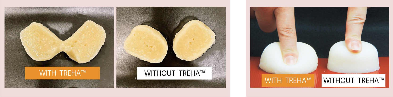 The featured visuals show tofu mochi samples with and without TREHA™ after freezing and boiling. These examples highlight how TREHA™ notably maintains the desired texture of mochi.