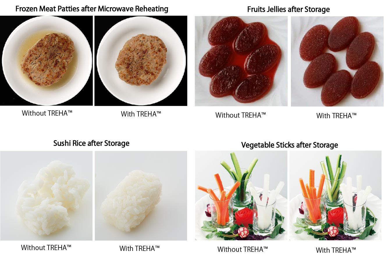 TREHA™ is a brand name of trehalose, a disaccharide with excellent moisture retention ability with unique molecular structure. Though it’s a sugar (it looks almost exactly like regular table sugar) and is similar in many ways to other sugars such as sucrose and maltose, TREHA™ is uniquely effective in promoting moisture retention, enabling it to protect foods from drying out.