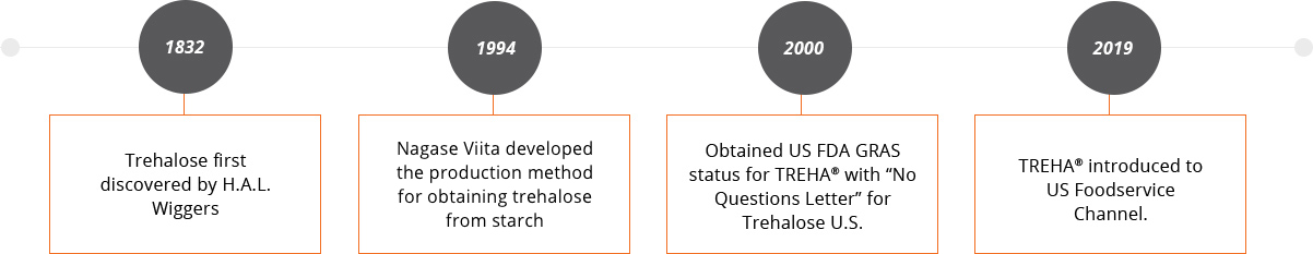 Though trehalose was first discovered in 1832 by H.A.L. Wiggers in an ergot of rye, it was tremendously difficult to extract. This made it so prohibitively expensive to produce in quantity that it was considered a luxury item. In fact, for more than 160 years after its discovery, the practical use of trehalose was considered impossible. It wasn’t until 1994 when the Japanese food ingredient company Hayashibara Co., Ltd. (Nagase Viita Co., Ltd. at present) developed a way to mass-produce trehalose from starch that it was able to be marketed commercially.