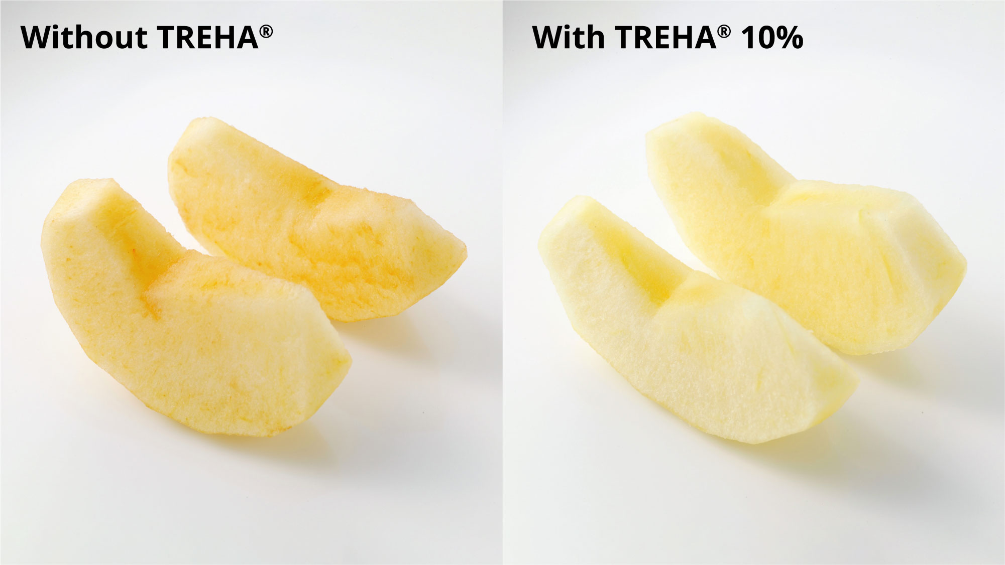 The cut apples in the lunch box turn brown, becoming less appetizing by lunchtime. Cut apples are typically soaked in saltwater to prevent discoloration, but adding saltiness to the sweet apple flavor is the downside. TREHA® comes in very handy to prevent browning. Instead of salt water, soak cut apples for 30 minutes in a 10% TREHA® solution. TREHA® slows down discoloration without changing the natural flavor of apples as its sweetness is only 38% of sugar. Apple slices (right) show significantly more minor browning than the untreated ones after being soaked in a 10%TREHA® solution for 30 minutes followed by 25 hours of refrigeration.