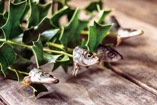 Now that mame-maki (豆まき) for driving away the demons is completed, we must prevent them from re-entering the house. Sardines (鰯 iwashi) play an active part. "Hiiragi iwashi (柊鰯),” meaning "holly twigs and sardine," is grilled sardine heads speared with holly twigs to be hung at the front door. In Western Japan, it is also called "yaikogashi (焼い嗅がし),” meaning "grilled stink.”