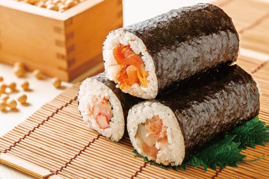 The Ehomaki (恵方巻) generally refers to a giant sushi roll containing fillings with seven ingredients taken after Shichi-fuku-jin, the seven deities worshiped in Japan to bring good fortune. Still, there seem to be no specific detailed rules. For ease of consumption, smaller-sized rolls are available such as half-cut rolls, medium-thin rolls, and hand-rolled sushi.