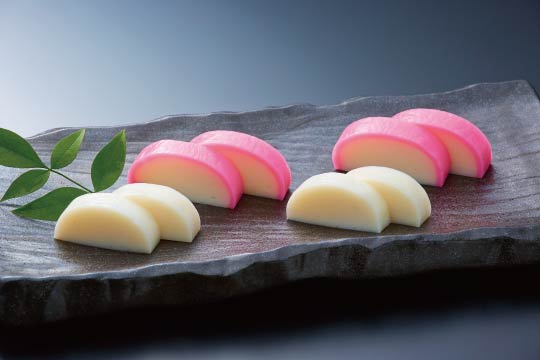 Kamaboko is a traditional steamed fish cake that comes in a pair of pink and white colors, symbolizing a lucky color combination of red and white (kohaku.) Kamaboko is often served in the New Year dish (Osechi ryoriおせち料理).