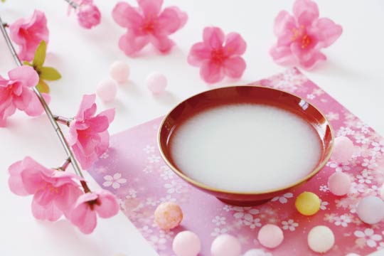 During the celebration, sake infused with peach blossoms were historically consumed because the pronunciation of peaches sounds similar to “centennial” in Japanese. Today, white sake is a sweet low alcoholic sake made of purred koji rice and steamed glutinous fermented in mirin (sweet sake) or shochu (distilled spirit) for a month. Children’s alternatives are non-alcoholic amazake (fermented sweet rice drink) or juice.