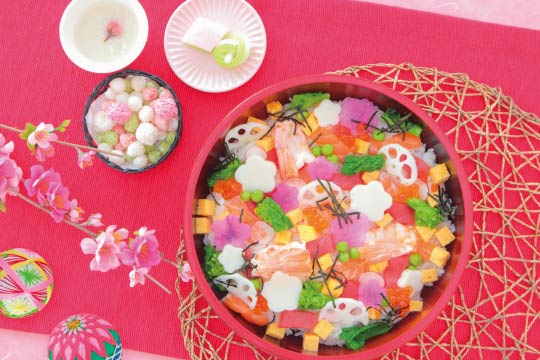 For the Hinamatsuri festival, gorgeous Chirashi-sushi is prepared using colorful toppings such as red prawns, white lotus root, and green beans to amplify the festivity in spring.