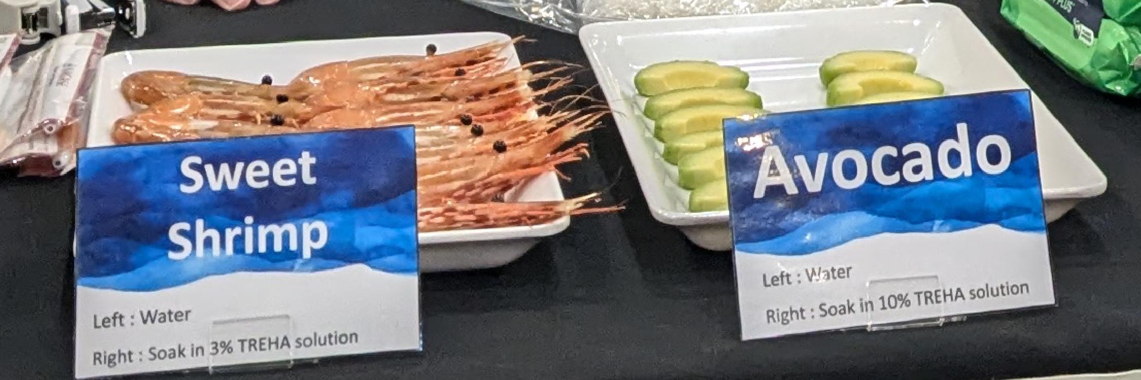 The uncooked sweet shrimp (amaebi) display further demonstrated TREHA®'s effectiveness, as it helped maintain the shrimp's original color and volume over time. The samples looked so appetizing that I often reminded guests, "These are uncooked and have been at room temperature for a few hours. I know they look tempting, but please don't eat them!" A few guests seemed disappointed, and we appreciate their understanding.