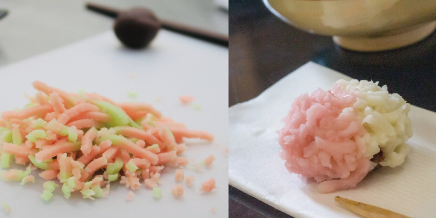 The Mushakojisenke school's traditional sweet for the first tea ceremony of the year is inspired by the poem “Miyako no Haru” (Spring in the Capital). The phrase 'the willows are green, the flowers are crimson' vividly describes the vibrant spring of Kyoto, where willows bud green and flowers bloom brightly. This imagery is beautifully captured through the green and red shades in the confection known as “Kinton.”