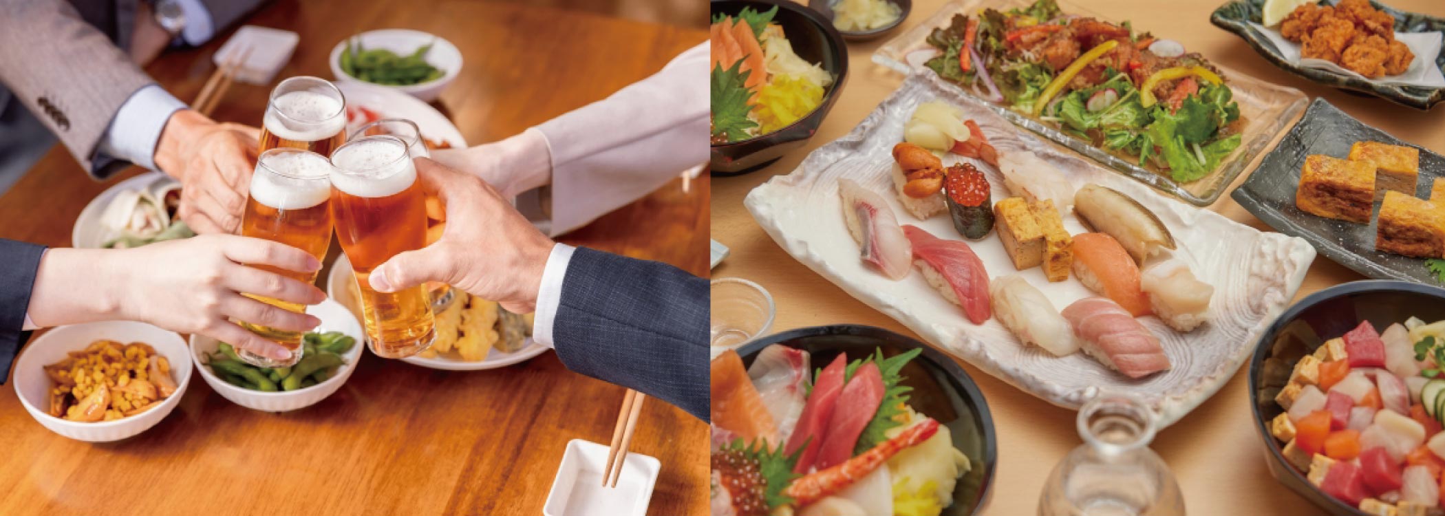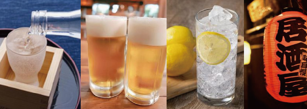 Izakaya menu is centered around enjoying alcohol. Although Edamame (boiled green soybean), Sashimi (raw thin fish fillet) and Karaage (Japanese fried chicken) are popular classics, each restaurant and region has characteristic specialties. One of the features of Izakaya is a course of dishes that pairs with “all-you-can-drink”. Customers can enjoy a course of dishes including an appetizer, main dish, side, and dessert, and unlimited alcohol drinks from a specific menu range. To avoid excessive drinking and food loss, the restaurants have a “one glass at a time” policy; customers can order free refills of their drinks in exchange for their empty glass.