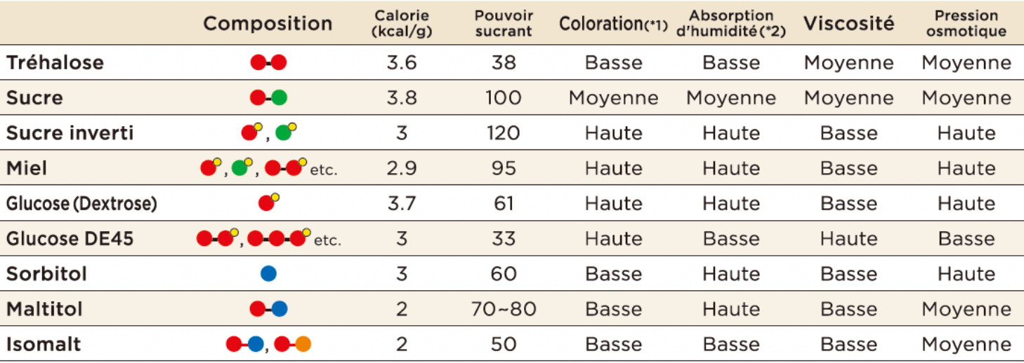 Le tréhalose est un glucide stable comparé au sucre. Il se décompose moins par la chaleur ou le pH. Il est moins sensible à la réaction de Maillard et se caramélise moins. Cela permet donc de garder la couleur des aliments.