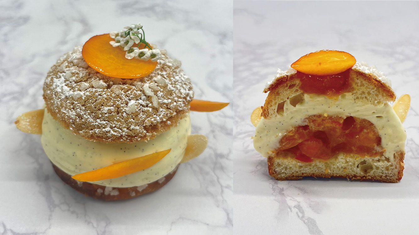 Place the frozen apricot confit on the bottom layer, then pipe 40g of diplomat cream over the confit using a 20 mm tip.