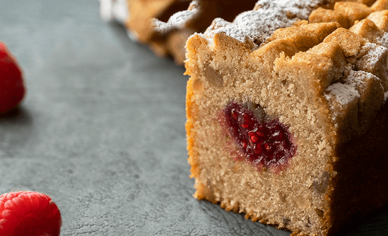 Pipe 30 g of raspberry jam by using #13 nozzle onto the centerline of butter cake batter.
