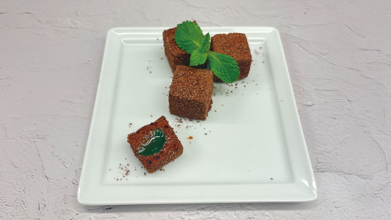 Unmold the chocolates and coat the exterior with cacao nibs.