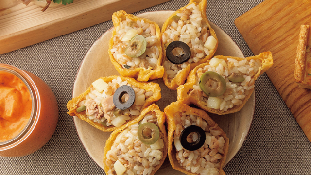 Grill tofu pouches until well browned and crisp. Cut them diagonally in half.