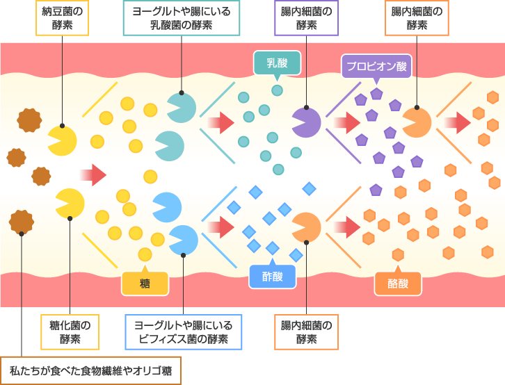 食事で摂った食物繊維は、そのままで乳酸菌やビフィズス菌が消化できるわけではありません。腸ではいくつかの菌によるリレーが起こり、その結果として短鎖脂肪酸が生まれています。腸に入った食物繊維はまず納豆菌や糖化菌の働きによって分解され、ブドウ糖に変わります。この形になると乳酸菌やビフィズス菌が働いて乳酸や酢酸を生み出すことができます。そこからもう一段階、腸内細菌が作用して短鎖脂肪酸であるプロピオン酸や酪酸が産生されるのです。