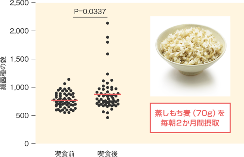 兵庫県の加東市と(株)マルヤナギ小倉屋、および当研究所の間で三者連携協定を結び、市職員の皆さんに、食物繊維を多く含むもち麦を毎朝2か月間食べてもらい、腸内細菌を調べるという研究を実施しました。その結果、摂取前後で比較すると、腸内細菌の種類が増え、1000菌種以上の方が3%から約17%に増加。中には2000種類以上にまで増加した方もいて、全体で見れば食物繊維が腸内細菌の多様性を高めることが確認されました。しかし、参加者の中には多様性に変化なし、あるいは低下する人もいて、ここでも同じ食事を摂っても、その効果には個人差があることが示されています。この効果が出やすい人、出にくい人を分けて(層別化)、個人差を生み出している因子を同定し、効果が出ない人の改善法を見いだす。このような形で、それぞれの腸内環境に合わせた最適な食事を提供するための層別化栄養の取り組みが進んでいます。