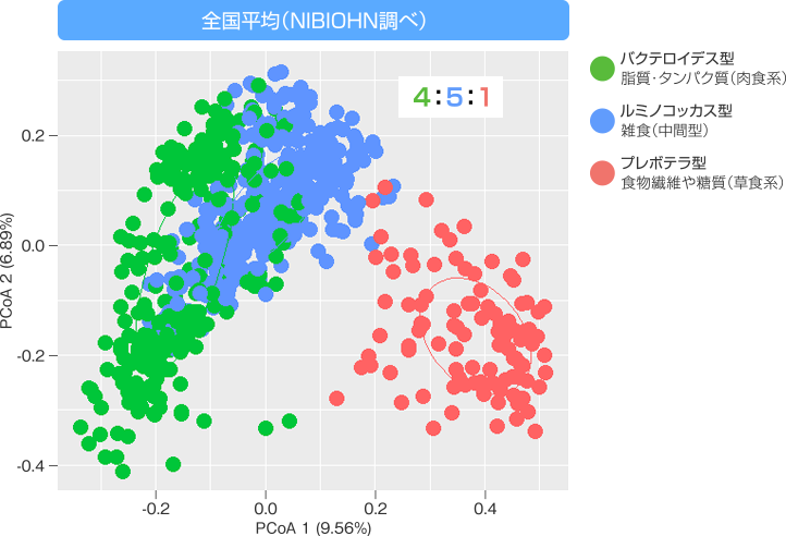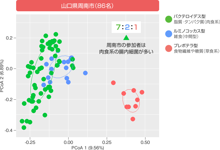 ひとつ興味深いデータをご紹介しましょう。山口県周南市という瀬戸内海に面した地域で腸内細菌を調べる研究を続けて7年目になるところですが、こちらの方々の腸内細菌のタイプを先ほどの肉食系、雑食系、草食系で分けてみました。私たちの全国平均データでは、肉食系、雑食系、草食系の比率が4:5:1くらいになりますが、周南市の場合は7:2:1という結果で肉食系の方が多いことが分かりました。