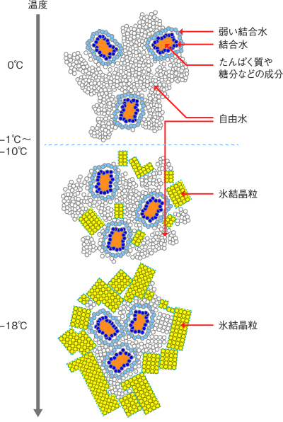 食品の温度を下げていくと、食品成分の周りの自由水と呼ばれる水分から氷の粒が発生します。冷却を続けていくと水分のほとんどは氷になり、凍っていない部分は濃縮されてゆきます。