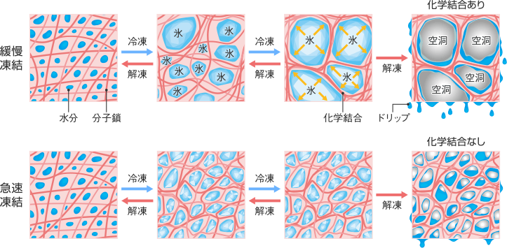 緩慢凍結の場合は、氷結晶が肥大化し、そのときにその周囲が圧迫され、組織が結合します。食品にもよりますが、解凍した際にドリップが流れ出て、この結合した組織が元に戻らず、組織中に空洞ができてしまいます。このことが食品の食感の悪さに影響するのです。