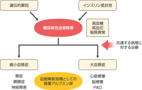 血糖が高くても、多くは自覚症状がありません。それでも、早期の発見と治療が必要とされているのは、高血糖が血管を障害する大きな要因となり、さまざまな合併症を引き起こすためです。特にいま問題になっているのが糖尿病性腎症で、日本では透析患者さんの第一の原因が腎症の進行によるものです。また、心臓の冠動脈の硬化による狭心症や心筋梗塞が増加していますが、このバックにも糖尿病があります。脳の病気では、脳梗塞をきたすばかりでなく、認知症のリスクを高めることが注目されています。このように、糖尿病はさまざまな血管合併症を自覚症状のない期間に起こしますので、早く高血糖を改善して、血管を守ることが必要です。
