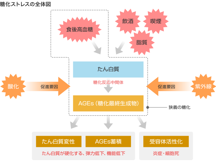 そうですね。AGEsは糖の影響だけでなく、飲酒や喫煙、脂質の過剰摂取といった様々な要因によっても生成されることがわかっています。また、酸化ストレスや紫外線によって糖化反応が促進されたりもします。このため私たちは、AGEsの生成や蓄積による影響を総合的に捉えた概念のことを「糖化ストレス」と呼んでいます。