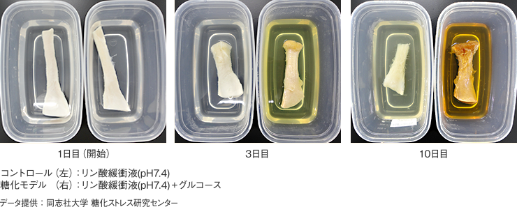 変化を目で見えるようにしたモデルで説明しましょう。下の写真は、牛のアキレス腱(コラーゲンのかたまり)を溶液に浸したもので、2つの容器のうち、右側がブドウ糖を入れた糖化モデルです。これを60℃の温度で温めていくと、ブドウ糖を加えたものは日数が経過すると茶色く変わっていくのがわかります。これが目に見える糖化の進行です。