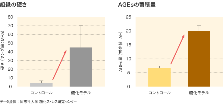 10日後にこのアキレス腱を取り出してみると触っただけで糖化モデルの方が硬くなっていると感じられます。機器を使って計測してみると下のグラフのように、明らかに糖化モデルの方が硬くなっていることがわかりました。また、AGEsの蓄積量も糖化モデルの方が圧倒的に多いことがわかりました。