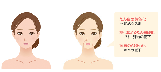 その通りです。糖化ストレスは全身の組織に影響を及ぼしますが、それが一番わかりやすく出てくるのが “見た目の老化”であるといえるでしょう。先に述べたように、糖化ストレスによって、肌の色が徐々に黄褐色に変化してクスミが生じ、弾力性やハリが失われ、さらにAGEsが蓄積した肌はキメがなくなってのっぺりとした状態になります。これらが顔に現れてくると“老けた顔”に見えてしまうのですね。糖化と見た目の関係についての論文もいくつか出ています。事実AGEsが肌に蓄積していたり、血糖値が高かったりすると実年齢よりも老けて見えるという研究結果が報告されています。