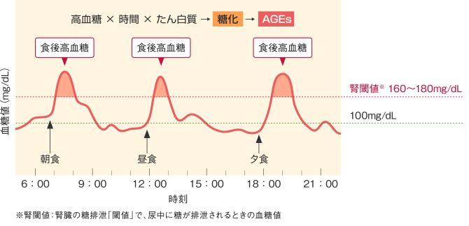 糖化ストレスを減らすためにまず大切なのは、体の中の糖、つまり血糖をうまくコントロールすることです。よく、糖尿病の話になると高血糖という言葉が聞かれますが、健康な人でも食事をとれば血糖値が高い状態になります。健康な状態であれば、それを感知した膵臓からインスリンというホルモンが分泌されて、その働きによって血中の糖は細胞に取り込まれ、血糖値が下がっていきます。このように体の中では食事をするたびに血糖値の上がり下がりを繰り返しているのです。しかし、ここで注意が必要なのは食後に起きる血糖値の急な変化です。最近マスコミ等では、食後血糖値の急激な上昇と下降を「グルコース・スパイク」と呼び、よく取り上げるようになりました。下図に示したように、普通の食生活をすれば1日3回の食事の後にグルコース・スパイクが現れます。食後の血糖値が高い状態が続いたり、間食(おやつ)をたくさん食べて何度も血糖値を上げると、体の中では糖とたん白質が結合して糖化反応が進んでしまうのです。ですからグルコース・スパイクをいかに軽減するか、いかに血糖値のピーク(グラフの高さ)を低くし、高血糖の時間を少なくするか、血糖値を上げる回数を適切にするか、要するにグラフに現れたグルコース・スパイクの面積を小さくすることが糖化ストレス対策のポイントになります。
