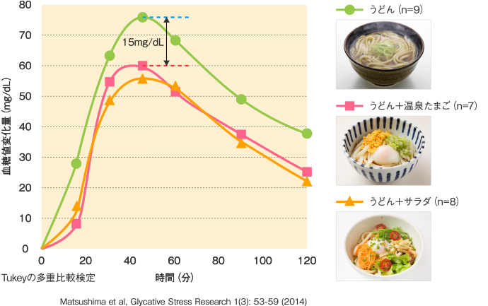 うどんに温泉玉子、サラダを添加したときの食後血糖値変化