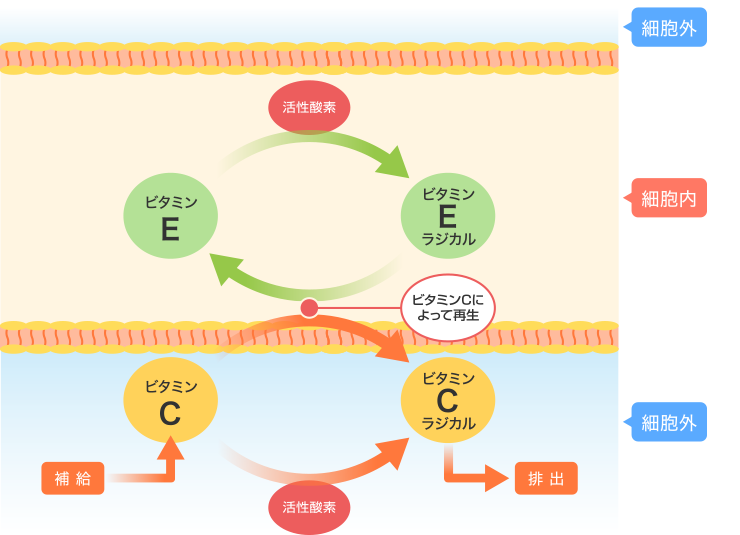 水溶性のビタミン。抗酸化物質の中では活性酸素を消去する能力が抜群に高く、細胞膜の酸化を外側から守るなど、細胞外での抗酸化に働きます。ただし、体内にとり入れてもすぐに代謝され体外に排出されてしまうため、不足気味になりやすいビタミンです。