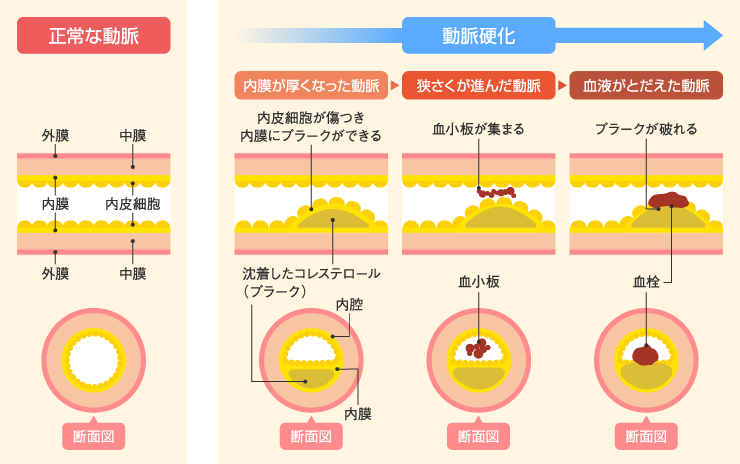 血管は内膜・中膜・外膜の三層からできていますが、このうちの一番内側の薄い層である内膜が傷害されると、そこにコレステロールがたまって盛り上がり、さらにそこに血小板が集まって血栓ができてしまいます。これらにより血管の内腔が狭くなった状態が動脈硬化です。血液の流れが悪くなりますし、進行して血管が完全にふさがってしまうと、その先に血液が流れず、臓器が正常に機能しなくなってしまいます。