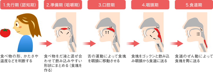 私たちがあたりまえに行っている毎日の食事は、次のような5段階の過程を繰り返しています。 この一連の動きのいずれか、あるいは複数の段階で問題が発生する状態が摂食・嚥下障がいです。