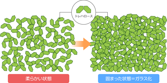 窓ガラスなどのガラスはケイ酸という物質が固まったものですが、これをバーナーで熱していくと、ある点でグニャッと柔らかくなり、冷えるとまた固まります。このように結晶化しない物質が温度や水分含量によって柔らかい状態から固まった状態になることをガラス化といいます。糖の場合、濃い水溶液を作って、だんだん水を飛ばしていくと粘度が高まって水あめ状になり、さらに水分を減らすか温度を下げると飴玉のように固まりますね。これが糖のガラス化です。トレハロースは、スクロースやマルトースなど二糖という同じグループの糖の中で最もガラス化しやすく、他のニ糖ではガラス化しにくい比較的高い温度でも、トレハロースは安定にガラス状態になります。