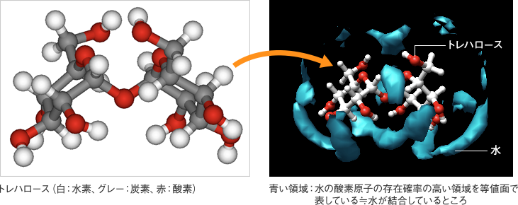 その理由は分子にあります。ひとつには、糖の分子は水酸基OHを持っていますが、この数が多いほど水を引きつける力が強いと言われます。水分子を引きつける現象を「水和」と表現されますが、グルコースのOHが5個に対し、トレハロースやスクロースは8個持っているので、より水和しやすいのです。さらにこの2つの糖を比較すると、トレハロースの結合力が少し強いことが示されています。