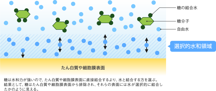 そうですね。たん白質や細胞膜は表面に「結合水」を持っています。結合水があることで細胞の立体構造が安定して維持されているのです。結合水がなくなってしまうと細胞は壊れて死んでしまいますが、その時にトレハロースが入ってくると、まず結合水の代わりにたん白質や細胞膜の表面に結合します。さらに充填材のように細胞の中に蓄積され、ガラス化という現象によって細胞を固めてしまうので、細胞は元のままの構造を保つことができます。