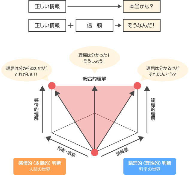 単純に考えると、きちんとした情報を身につけてさえもらえれば、論理的・科学的な判断ができるということになります。実際に30分も話せば納得してもらえる場合も多い。ところが、中にはいくら話しても、情報をたくさん出しても、論理的判断に至らない人もいます。この両者の違いは何か? それが信頼関係なのです。話し相手が信頼できる人だと思うと、話がすんなりと入ってきて、そうなんだと納得できる。しかし、信頼がないと話を聞けば聞くほど、「自分を騙そうとしているのではないか」、「ごまかそうとしているのじゃないか」と懐疑的になり、頑なになってしまうことがあります。ですから、リスコミで最も大事なのは信頼関係を築くことなのです。