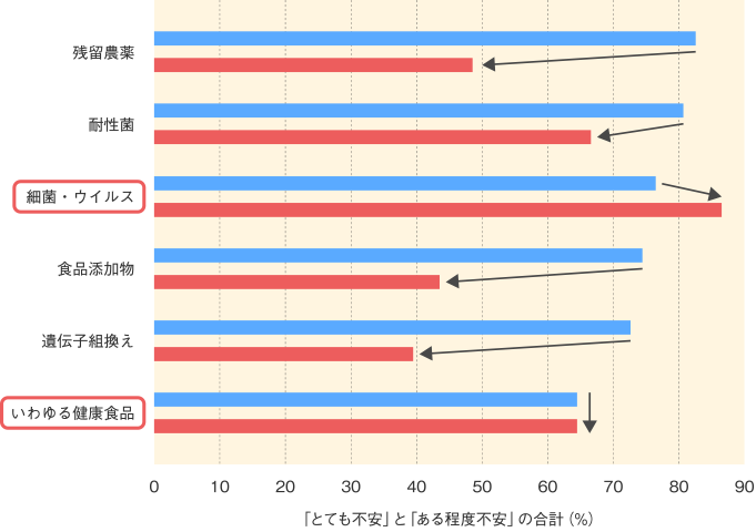 私がお手伝いしている食品安全委員会で「食品安全モニター」を募集し、食品への不安についてアンケート調査した結果について2006年と18年を比較したものが次のグラフです。