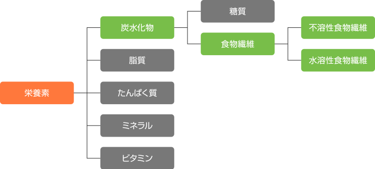 五大栄養素の一つである炭水化物は、糖質と食物繊維に分かれます。さらに食物繊維は大きく不溶性食物繊維と水溶性食物繊維の2種類に分類されます。