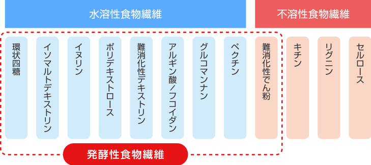 なおすべて食物繊維が腸内細菌のエサとなり発酵するわけではありません。発酵性食物繊維に該当するのは多くの水溶性食物繊維と一部の不溶性食物繊維です。また、発酵性食物繊維は種類や繊維の大きさによって、腸内で発酵する場所や、食べてから発酵がはじまるまでの時間が異なるため、様々な種類の発酵性食物繊維を摂ることが大事です。