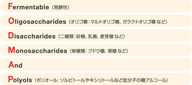 FODMAPは、腸で発酵しやすい糖質の総称で、以下の成分の頭文字を組み合わせたものです:
