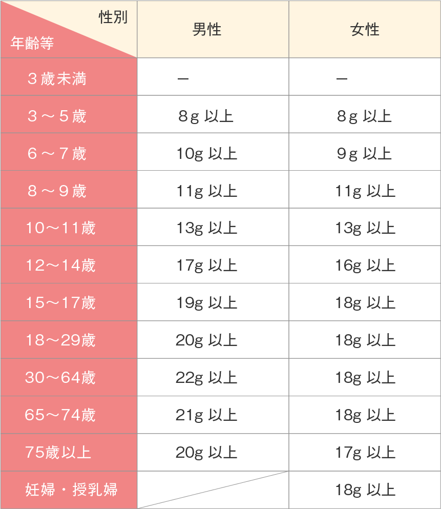 日本人の食事摂取基準(2025年版)では、この理想と実際の摂取量を加味し、年齢と性別に応じた目標量が設定されています。この目標量は、生活習慣病の予防のため、日本人が当面の目標とすべき摂取量です。