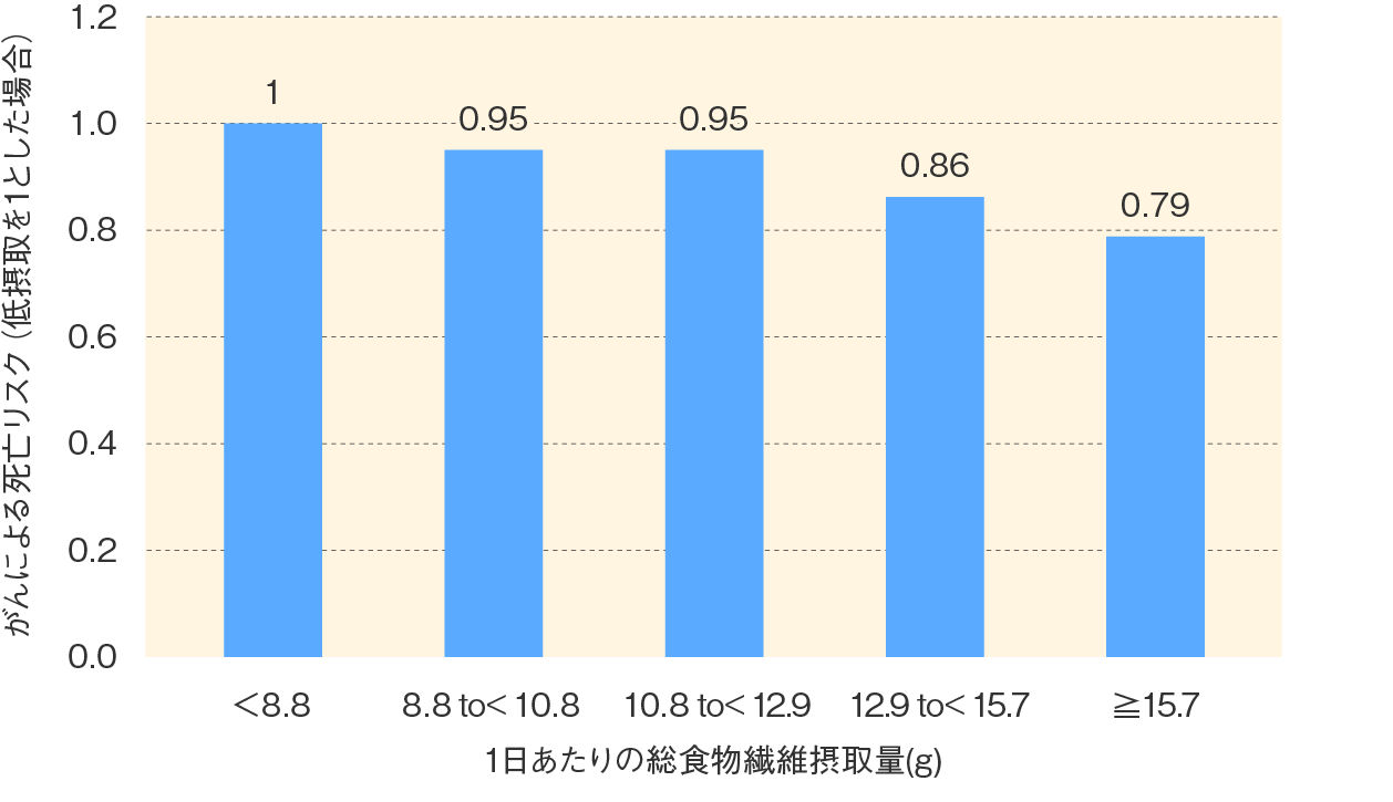国立がん研究センターの大規模な追跡調査によると食物繊維の摂取量が多い人ほど総死亡リスクが有意に低下していることが示されています。