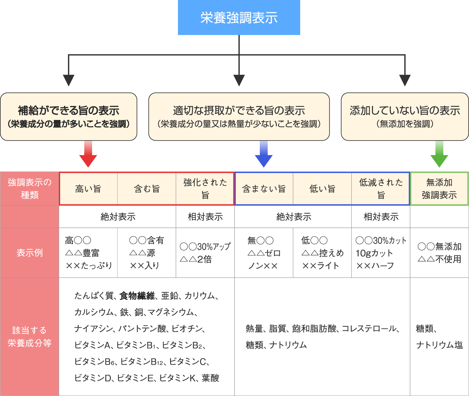 不足や過剰摂取により健康の保持増進に関わる栄養成分は、基準に基づいて栄養強調表示をすることができます。食物繊維は、定められた条件を満たせば、「食物繊維たっぷり」など、栄養成分の量が多いことを強調する表示ができます。