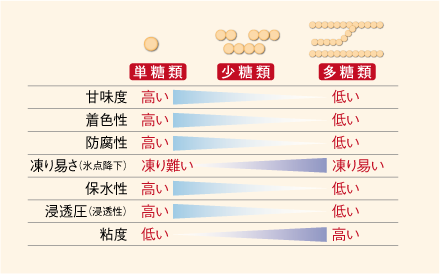 | 3. 食感調整 | 食品中に糖が溶けて存在すると軟らかく、滑らかな食感に、結晶するとシャリシャリした食感になる。 |