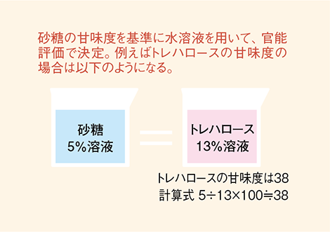甘味度は砂糖の甘味を基準にして調べたい糖と比較することによって導き出します(官能評価法の2点識別法を用いる)。例えばトレハロースの甘味度は、まず基準となる砂糖の5%の水溶液と様々な濃度のトレハロース水溶液を飲み比べることにより、2つの甘さが同等と感じるトレハロースの濃度を探します。そして砂糖の甘味度を100※として相対値で表します。砂糖5%水溶液とトレハロース13%水溶液が同じ甘さとなるため、5÷13×100≒38となり、トレハロースの甘味度は38と導き出されます(図4)。