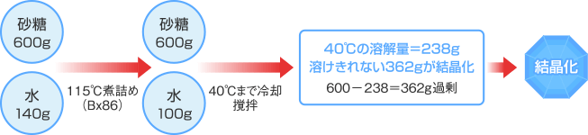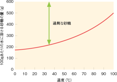 結晶する糖にはそれぞれ固有の溶解度(水に溶け込める糖量)が存在しており、その溶解度よりも濃度が高くなった場合に結晶がでてきます。