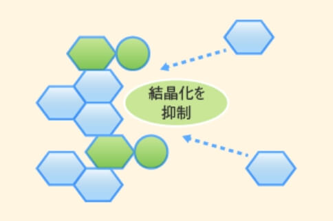 結晶性の糖が結晶になろうと集合する際に、非結晶性糖の同じ構造の部分が入り込んでしまうので結晶構造がスムーズに進まず、結果効率的に結晶をおさえることができます。