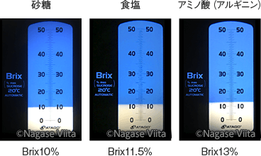 - Brixの目盛は砂糖水溶液の濃度(w/w%)を刻んでおり、純粋な砂糖溶液の場合は正確にBrix値=糖度となります。砂糖以外の糖の場合は、分子量によって屈折率が若干変わってしまうため、少々ズレを生じます。また、水溶性のものは屈折率に影響してしまうため、糖以外の塩やクエン酸、アミノ酸なども全て含んで測定されます。食品を測定するときはBrix値≒水溶性の固形分量と思っていただいてよいですが、同じ固形分量でも物質によってBrix値は異なります(写真1)。