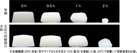 糖を加えることで凍る温度を下げることができます。つまり凍りにくくすることができます。これは凝固点降下という現象で、水道水など不純物を含む水は0℃付近で凍りますが、砂糖水はさらに温度を下げなくては凍らなくなります。この現象は同じ濃度であれば分子量に比例しており、分子量が小さい糖を使用するほど凍りにくく、溶け易くなります(写真3)。また、糖の濃度を上げていくと、どんどん凍りにくく、溶け易くなります。