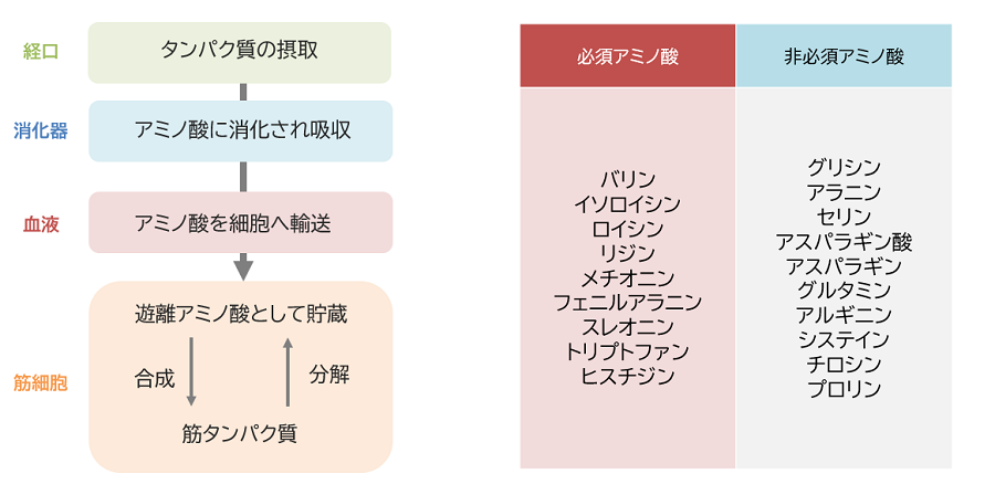 ヒトのタンパクは20種類のアミノ酸で構成されており、これらのアミノ酸が細胞中に材料としてあることで筋肉の合成は進んでいきます。特に体内で合成できないアミノ酸は必須アミノ酸(9種類)と呼ばれ、体外からしっかりと補うことが筋肉合成に重要となります。